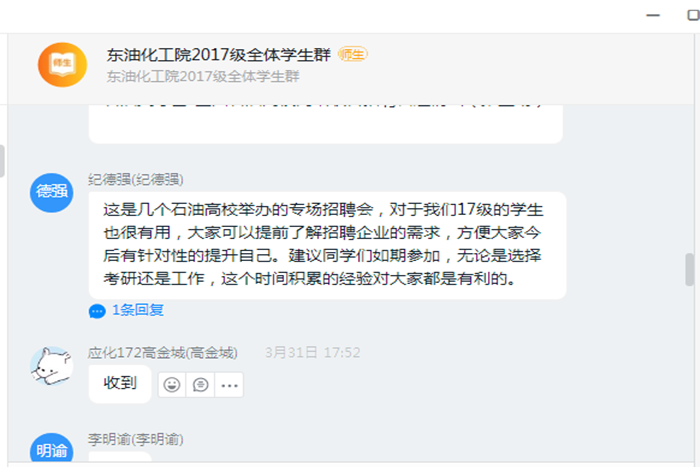 注重就业意识向下延伸,借学业预警之际强化专业指导和就业指导。就业工作从表面上来看,是考验大四年级学生的成绩和综合素质,实际上,是对大学四年人才培养质量的全面检验。学工组的专、兼职辅导员借助学业预警谈话之际,与大一、大二、大三的部分同学谈心,在聊学习、聊成绩的同时,进一步让学生明确通过外语四六级的重要性,提高同学们对专业的重视和就业意识。大三学生也参与观看了毕业年级就业大会的直播,提前感受就业、参与就业,树立危机意识、激发拼搏精神。目前,2017级的同学已经参与了石油英才荟--全国石油高校网络联合招聘会的相关活动,正在准备观摩“东北振兴、‘职'等你来”2020届东北七校空中双选会,为下学期即将来临的招聘季做好热身。