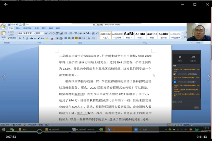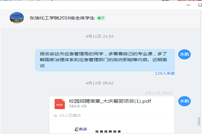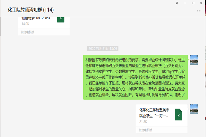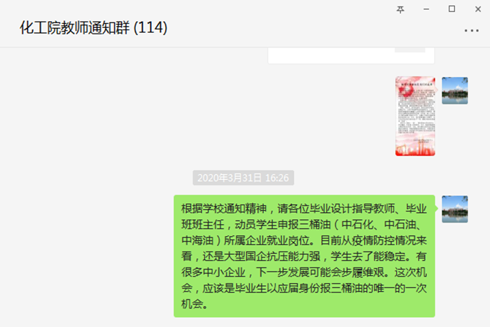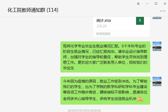 注重信息发布和就业指导,打通毕业生求职就业最后一公里。学院辅导员24小时在线,及时发布各种就业信息并开展专项解读,加强对学生的教育和引导,组织学生积极参加学校举办的线上招聘活动。针对未就业学生,辅导员做到一对一谈话,了解学生的真实想法和存在的困难,建立未就业学生档案并及时向专业教师通报,以形成促就业合力。日前,学院通过毕业年级钉钉群召开年级大会,向同学们宣传国家就业政策和学校就业工作部署,邀请学校就业指导中心副主任王雷讲解当前的就业政策、化工院往届毕业生就业去向、国内大型石化炼化企业发展前景和人才需求情况以及毕业生档案等事宜,邀请企业人事部门招聘主管为学生讲解求职经验并传授线上面试的技巧。活动对毕业生就业工作起到良好推动作用并得到了同学们的好评。