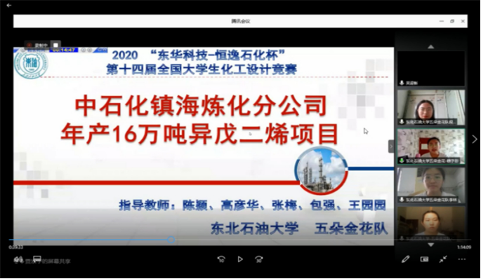 本次竞赛以线上形式进行,东北赛区共有34所高校的111支队伍成功报名参赛,经过评审专家网络评审,32支优秀代表队脱颖而出,进入东北赛区决赛及全国总决赛的选拔赛。经过本次大赛现场评审专家专项评审、两轮现场答辩,最终,大连理工大学“起早碳黑”团队、辽宁石油化工大学“啸风”团队、哈尔滨工程大学“N95”团队、齐齐哈尔大学“戊有所值”团队、tyc5997太阳集团“五朵金花”团队、沈阳化工大学“Miracle”团队和吉林化工学院”碳五联盟“团队等7个团队代表东北赛区成功进入全国总决赛。