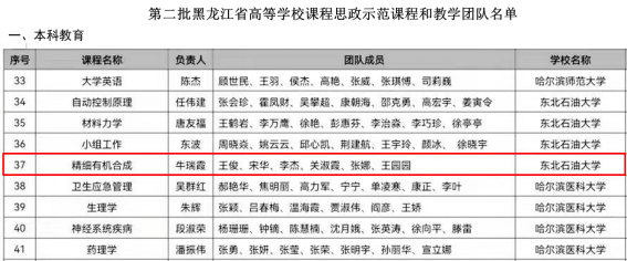 近日,黑龙江省教育厅公布了第二批黑龙江省高等学校课程思政示范项目评选结果,我院应用化学系牛瑞霞副教授申报的《精细有机合成》荣获黑龙江省第二批高等学校课程思政示范课程及教学团队。