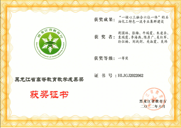 近日,黑龙江省教育厅公布了2022年黑龙江省高等教育教学成果奖评审结果,我校共10项成果入选,其中,特等奖1项,一等奖3项,二等奖6项。我院荆国林教授主持的《“一核心三融合六位一体”的石油化工特色一流专业集群建设》荣获一等奖,并代表我校参加2022年国家教育教学成果奖的申报,这也是我院首次获得冲击国家级教学成果奖的机会,也为学科未来在教学方面取得高级别成果增强了信心。