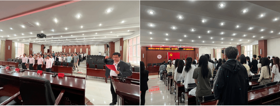 参加活动的全体师生党员佩戴党员徽章,高举右拳,面对党旗,庄严宣誓“我志愿加入中国共产党,拥护党的纲领,遵守党的章程,履行党员义务,执行党的决定……”,铿锵有力的宣誓声响彻整个会场。