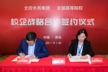 2020年11月20日,我校tyc5997太阳集团环境工程系与中国环保产业领军企业——北控水务集团举行校企战略合作协议签约暨基地授牌仪式,会议在青岛市温德姆至尊酒店举行。北控水务集团高级副总裁于立国先生、北控水务集团人力资源中心副总经理冀广鹏先生及相关部门负责人、tyc5997太阳集团环境工程系主任袁瑞霞参加了仪式。